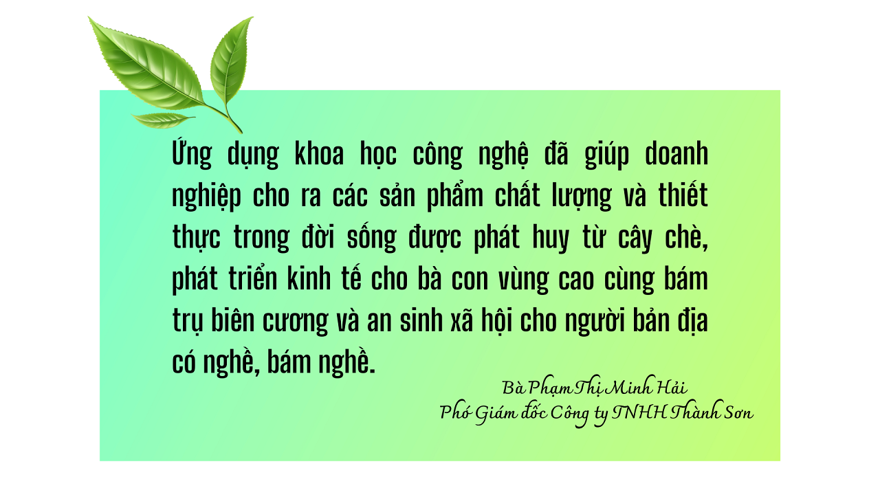 Hay nói cách khác, nhờ ứng dụng khoa học công nghệ đã giúp Thành Sơn cho ra các sản phẩm chất lượng và thiết thực trong đời sống được phát huy từ cây chè, phát triển kinh tế cho bà con vùng cao cùng bám trụ biên cương và an sinh xã hội cho người bản địa có nghề, bám nghề.