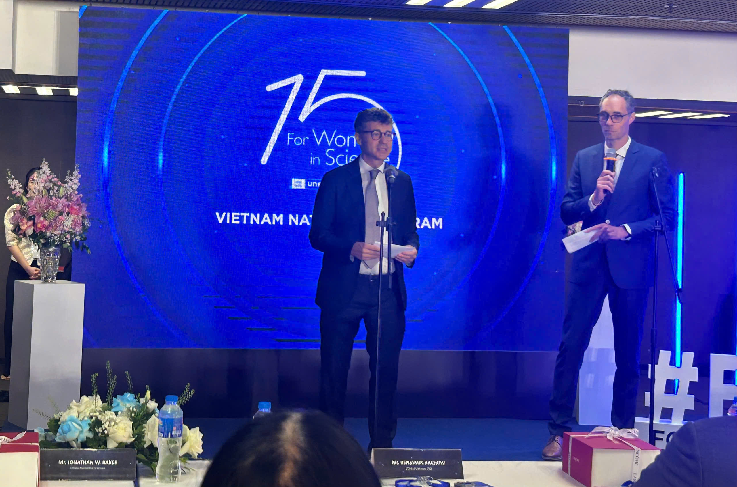 Ông Jonathan Wallace Baker- Trưởng đại diện UNESCO tại Việt Nam (bên trái) và ông Benjamin Rachow- Tổng giám đốc điều hành của L’Oréal Việt Nam chia sẻ về hành trình 15 năm chương trình Giải thưởng “L’Oréal- UNESCO tại Việt Nam.