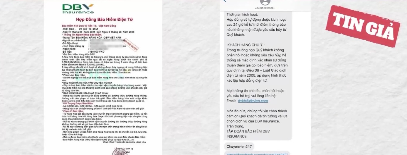 Hình ảnh hợp đồng bảo hiểm điện tử và tin nhắn giả mạo được các đối tượng sử dụng để lừa đảo. Ảnh: VTV