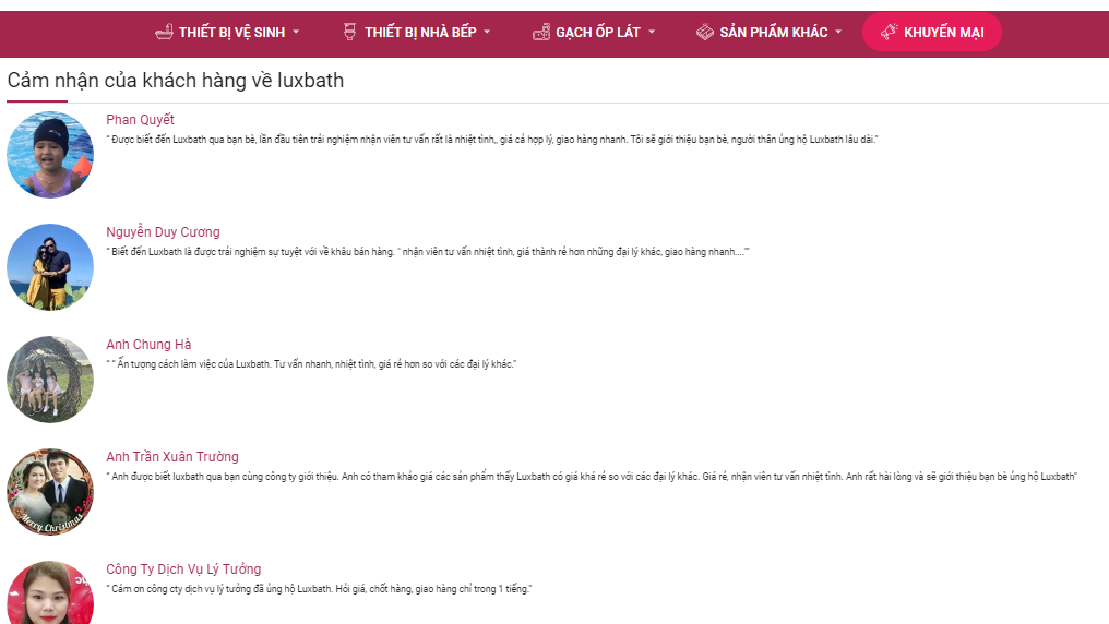 Không khó để bắt gặp những lời khen ngợi của hầu hết khách hàng sau khi trải nghiệm mua sắm tại nhãn hiệu cung cấp thiết bị vệ sinh cao cấp LuxBath. Chỉ riêng trên website công ty, hơn một nghìn khách hàng đã để lại phản hồi bày tỏ lời cảm ơn và tin tưởng.