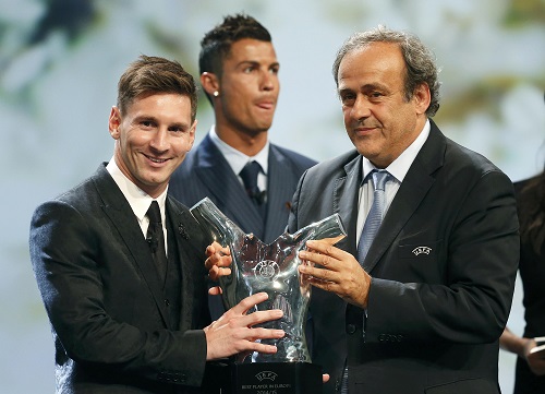 Messi nhận giải từ Chủ tịch Platini. Ảnh: Reuters.