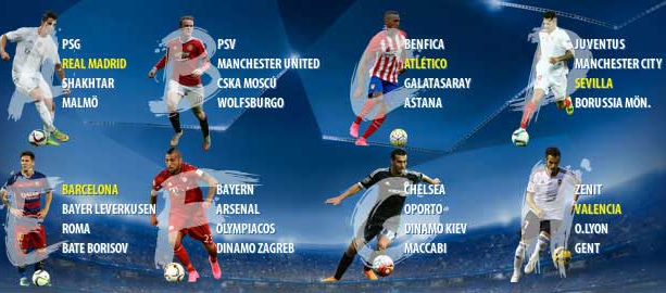 Kết quả bốc thăm chia bảng Champions League mùa giải 2015 - 2016. Bảng A: PSG (Pháp), Real Madrid (Tây Ban Nha), Shakhtar Donetsk (Ukraina), Malmo (Thụy Điển) Bảng B: PSV (Hà Lan), M.U (Anh), CSKA Moskva (Nga), Wolfsburg (Đức) Bảng C: Benfica (Bồ Đào Nha), Atletico Madrid (Tây Ban Nha), Galatasaray (Thổ Nhĩ Kỳ), Astana (Kazakhstan). Bảng D: Juventus (Italy), Man City (Anh), Sevilla (Tây Ban Nha), Monchengladbach (Đức) Bảng E: Barcelona (Tây Ban Nha), Leverkusen (Đức), AS Roma (Italy), BATE Borisov (Belarus) Bảng F: Bayern Munich (Đức), Arsenal (Anh), Olympiacos (Hy Lạp), Dinamo Zagreb (Croatia) Bảng G: Chelsea (Anh), Porto (Bồ Đào Nha), Dynamo Kyiv (Ukraina), Maccabi Tel Aviv (Israel) Bảng H: Zenit (Nga), Valencia (Tây Ban Nha), Lyon (Pháp), Gent (Bỉ) |