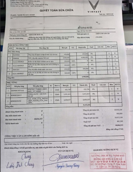 Anh Lường Đình Chung chia sẻ bảng quyết toán chi phí sửa chữa hơn 10 triệu đồng nhưng không phải trả đồng nào vì xe đang trong thời hạn bảo hành.“Lỗi đâu thay đó, hóa đơn của bạn là 0 đồng”, anh Lường Đình Chung, chủ xe VF 9 đăng bảng quyết toán chi phí sửa chữa với công và phụ tùng hơn 10 triệu đồng, nhưng được bảo hành hoàn toàn và không phải trả đồng nào. Trong đó, camera 360 độ của xe còn được thay mới cả bộ dây để đảm bảo tính năng hoạt động ổn định nhất.