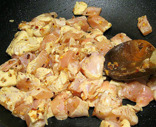 – Sau khi thịt gà thấm gia vị, làm nóng một tí xíu dầu ăn trong chảo, để đầu trắng hành lá vào phi cho thơm thơm lên, tiếp tục cho luôn tô thịt gà vào xào đến khi thịt săn chắc lại là được.