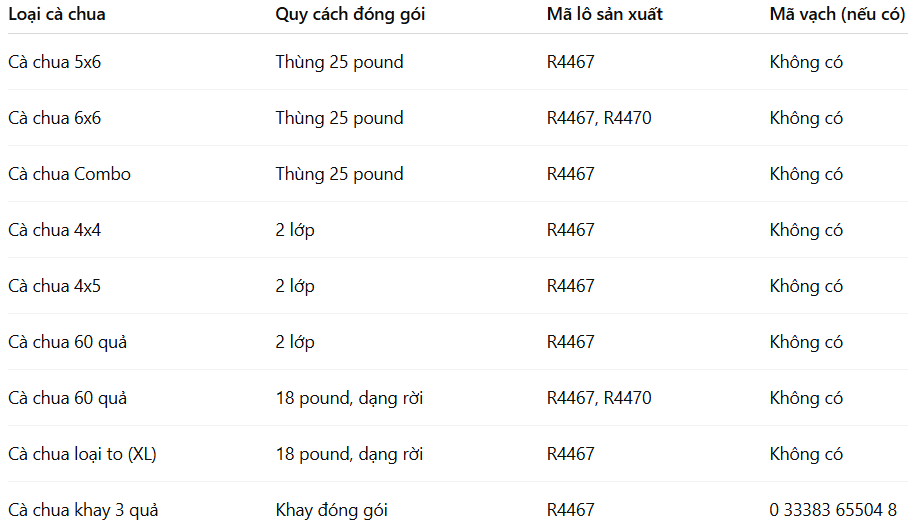 Tất cả các lô cà chua bị thu hồi đều đóng gói trong thùng 25 pound (tương đương hơn 11 kg), thùng 18 pound (hơn 8 kg) hoặc khay 3 quả, mang nhãn hiệu “Williams Farms Repack” hoặc “H&C Farms”. Cụ thể dưới đây: