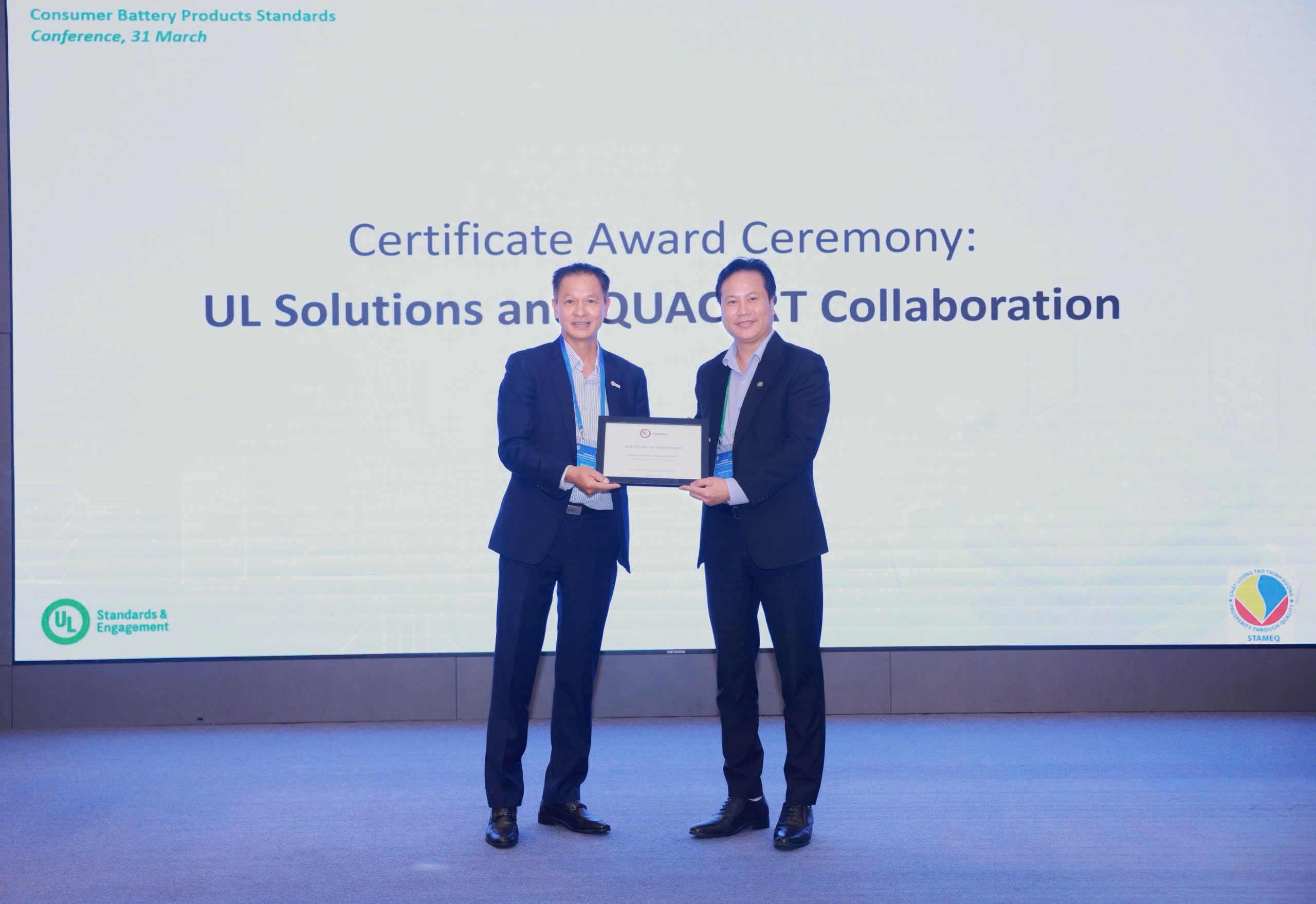 Trong khuôn khổ Hội thảo quốc tế về tiêu chuẩn an toàn đối với sản phẩm pin tiêu dùng diễn ra mới đây, Trung tâm Chứng nhận Phù hợp (QUACERT) đã vinh dự nhận được Giấy chứng nhận từ UL Solutions, đánh dấu bước tiến quan trọng trong hành trình hợp tác giữa hai bên.