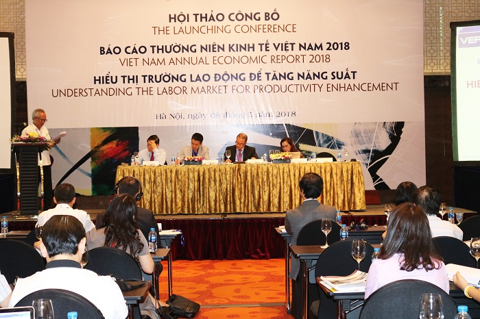 Quang cảnh Hội thảo công bố Báo cáo thường niên kinh tế Việt nam 2018 .
