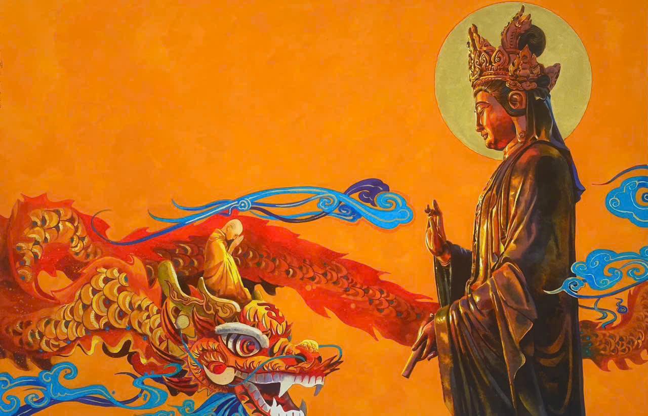 Bức tranh Tôn tượng Bồ Tát Di Lặc tại núi Bà Đen. Tranh: Hoàng PhongVới hoạ sĩ Hoàng Phong, những bức tranh này chính là hành trình tìm đến an yên, tìm lại chính mình sau những tổn thương trong quá khứ. “Khi tìm đến các ngôi chùa, đền để chiêm nghiệm về các giáo lý gần gũi mà Đức Phật đã truyền dạy, tôi dần bị cuốn hút bởi các công trình kiến trúc tâm linh. Bộ tranh đã ra đời như một cơ duyên, và tôi cũng mong mỗi người khi xem các bức tranh này cũng sẽ tìm thấy sự an yên, tĩnh tại”.