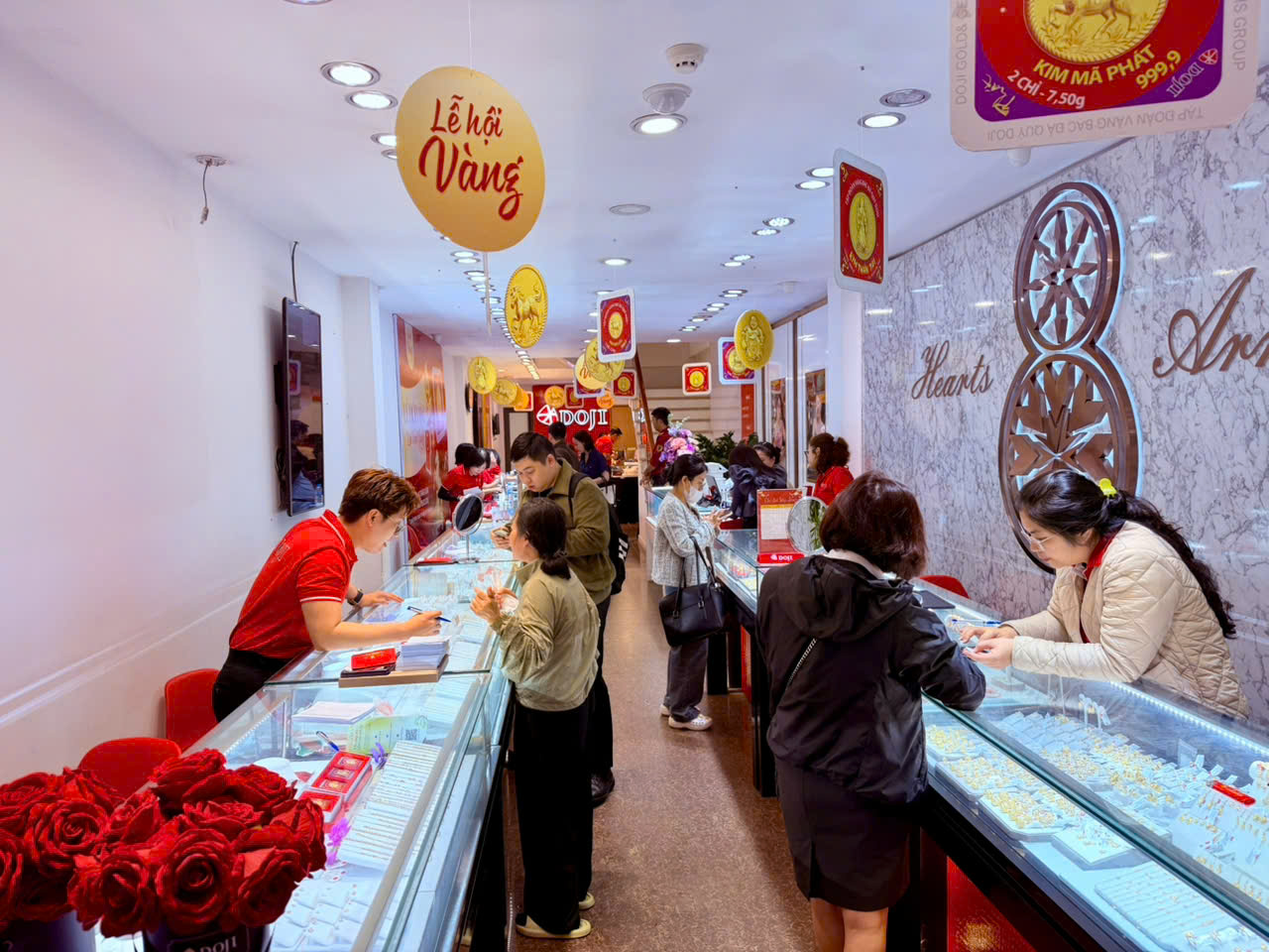 Trong dịp này, DOJI tổ chức Lễ hội Vàng 2026 với nghi thức rước Thần Tài từ ngày 24/2. Không gian được thiết kế theo concept “lễ hội xuân phố thị”, tái hiện các hoạt động truyền thống như múa lân, trống hội, xin chữ đầu xuân và hái lộc mai vàng. Phần quà giá trị nhất là nhẫn vàng 999.9, thu hút đông đảo khách tham dự.