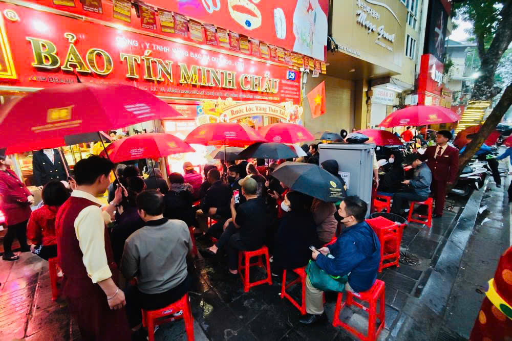 Trước cửa hàng Bảo Tín Minh Châu, dòng người “rồng rắn” xếp hàng trật tự trên vỉa hè, chờ đến lượt giao dịch.