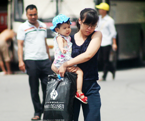 Nhiều em nhỏ theo chân ông bà, cha mẹ trở lại với Thủ Đô. Ảnh: Lan.