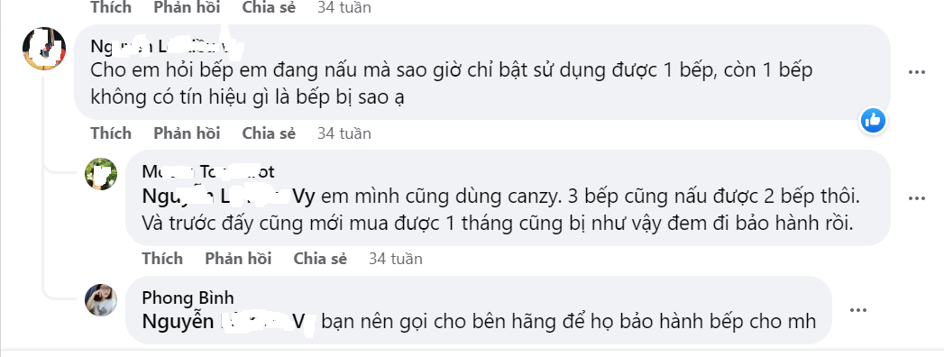 Không dừng lại ở đó, thời gian qua, toà soạn Chất lượng Việt Nam (VietQ.vn) nhận được phản ánh của người tiêu dùng về việc sản phẩm bếp điện từ Canzy của Công ty Cổ phần Canzy hay bị lỗi, hỏng, không đảm bảo chất lượng. Thậm chí có khách hàng chỉ mới mua sản phẩm dùng được 1 tháng đã phải đem đi bảo hành vì 1/3 vùng bếp nấu (loại bếp 3 vùng nấu) bị lỗi. Trên các hội nhóm người dùng bếp, có không ít bình luận phản ánh về việc bếp từ Canzy không đảm bảo chất lượng.
