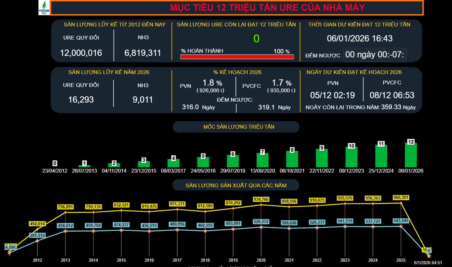 Vào lúc 16 giờ 43 phút ngày 06/01/2026, Nhà máy Đạm Cà Mau – Chi nhánh Tổng Công ty Phân bón Dầu khí Cà Mau (PVCFC) đã chính thức cán mốc sản lượng lũy kế 12 triệu tấn Urea quy đổi kể từ khi đi vào vận hành thương mại.