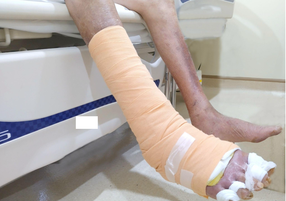 Chân phải của ông Tuấn bị nhiễm trùng vì lạm dụng corticoid. Ảnh: Đinh Tiên