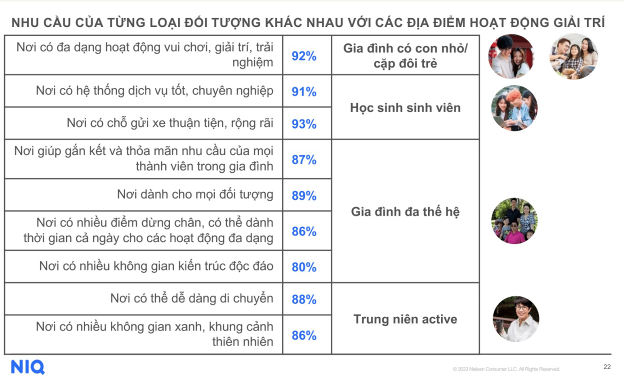 Xu hướng mua sắm kết hợp giải trí, trải nghiệm tại cùng 1 điểm đến đang thay đổi cách làm du lịch, trải nghiệm của các nhà bán lẻ, nhà phát triển du lịchSự thay đổi về nhu cầu cũng khiến khách hàng đặt ra yêu cầu ngày càng cao với các điểm đến. Trong cuộc khảo sát mới nhất của Nielsen IQ Việt Nam về xu hướng và hành vi tiêu dùng của khách hàng, từ học sinh sinh viên, cặp đôi trẻ, gia đình có con nhỏ cho đến giới trung niên, đều khao khát có những điểm đến đa dạng các hoạt động vui chơi, giải trí, trải nghiệm, kết hợp nhiều không gian xanh và khung cảnh thiên nhiên.