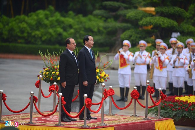 Chủ tịch nước Trần Đại Quang chủ trì lễ đón chính thức Tổng thống Francois Hollande tại Phủ Chủ tịch. Ảnh: Tri thức trực tuyến