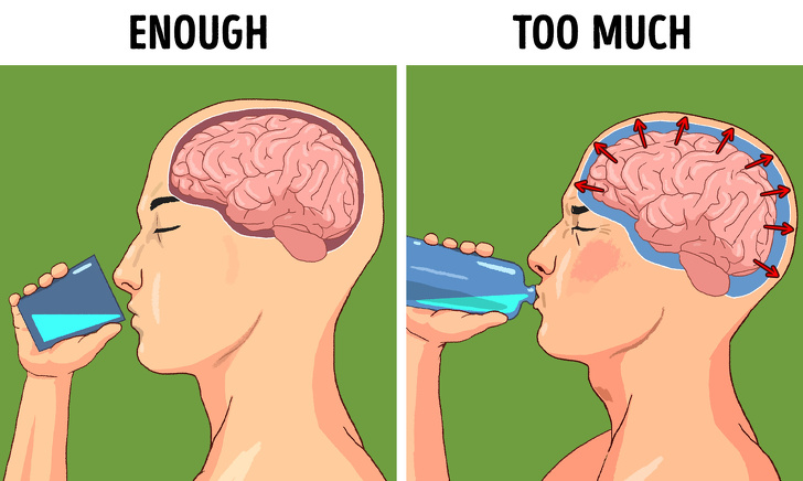Uống quá nhiều nước có thể tạo ra sự mất cân bằng điện giải, hạ nồng độ natri xuống thấp khi thận không thể xử lý nó nữa. Một hậu quả khác cực đoan hơn là việc này có thể gây sự tích tụ nước trong não, khiến nó sưng lên và tăng áp lực cho hộp sọ của con người. Mặc dù rất hiếm, cả 2 trường hợp đã được nhìn thấy ở các vận động viên cảm thấy cần phải bù nước sau một buổi tập dài hoặc ở những người có vấn đề về thận.