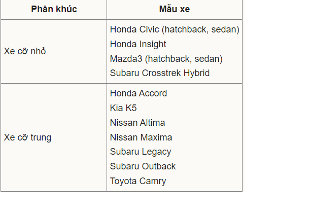 Viện Bảo hiểm và an toàn đường cao tốc Mỹ (IIHS) hàng năm công bố danh sách các mẫu ô tô giành điểm cao nhất trong những thử nghiệm va chạm và đánh giá an toàn. Danh sách cũng gồm rất nhiều mẫu xe mới giúp khách hàng có thêm nhiều lựa chọn.