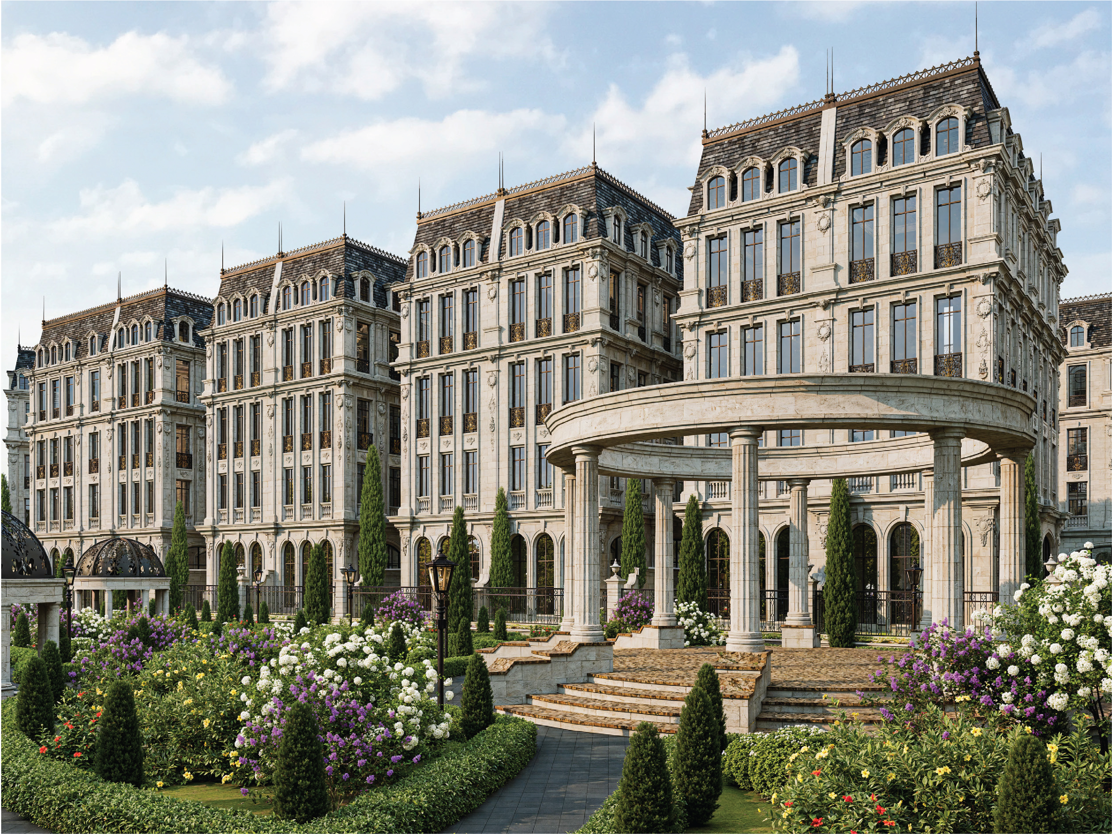 Lấy cảm hứng từ tinh hoa kiến trúc châu Âu, Noble Palace Long Bien được đầu tư công phu đến từng chi tiết: từ hệ mái Mansard uy nghi, thiết kế mặt đứng đối xứng tinh tế, phào chỉ lan can tinh xảo cho tới các chất liệu đá, gỗ tự nhiên… tất cả đều được tuyển chọn khắt khe và thi công theo tiêu chuẩn cao nhất của bất động sản xa xỉ. Không gian sống được tính toán kỹ lưỡng theo tỷ lệ chuẩn mực, kết hợp cửa sổ lớn đón sáng, trục gió xuyên suốt và các khoảng lùi hợp lý, giúp mỗi căn dinh thự luôn ngập tràn ánh sáng tự nhiên, mở tầm nhìn ra vườn cảnh riêng, hồ bơi và các mảng xanh nội khu.