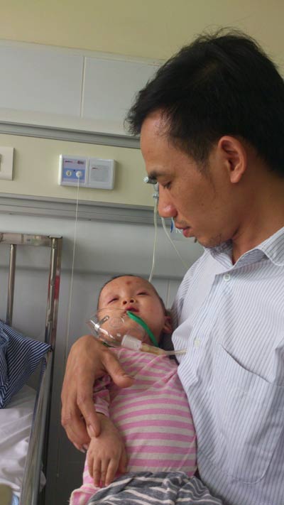 Anh Lê Văn Hải đang bế đứa con bị sởi biến chứng rất nặng.