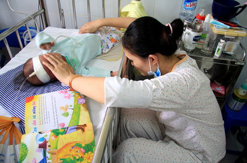 Chị Hiền (mẹ của cháu Nam) cũng không còn bình tĩnh để trò chuyện với chúng tôi như hôm trước. Chị ôm ghì đứa con trai mắt khép hờ và khóc.