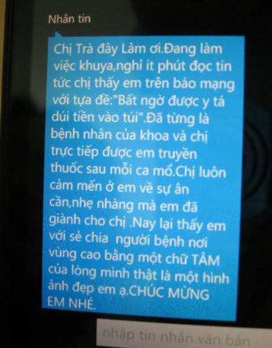 Cuối buổi trò chuyện, điện thoại cô Lâm có tin nhắn được gửi từ số của một nữ bệnh nhân cũ. Nội dung tin nhắn ghi rất rõ: “Chị Trà đây Lâm ơi. Đang làm việc khuya, nghỉ ít phút đọc tin tức, chị thấy em trên báo mạng với tựa đề: “Bất ngờ được y tá dúi tiền vào túi”. Đã từng là bệnh nhân của khoa và chị trực tiếp được em truyền thuốc sau mỗi ca mổ, chị luôn cảm mến ở em về sự ân cần, nhẹ nhàng mà em đã giành cho chị. Nay lại thấy em sẻ chia với người bệnh nơi vùng cao bằng một chữ Tâm của lòng mình thật là một hình ảnh đẹp em ạ. Chúc mừng em nhé!”.