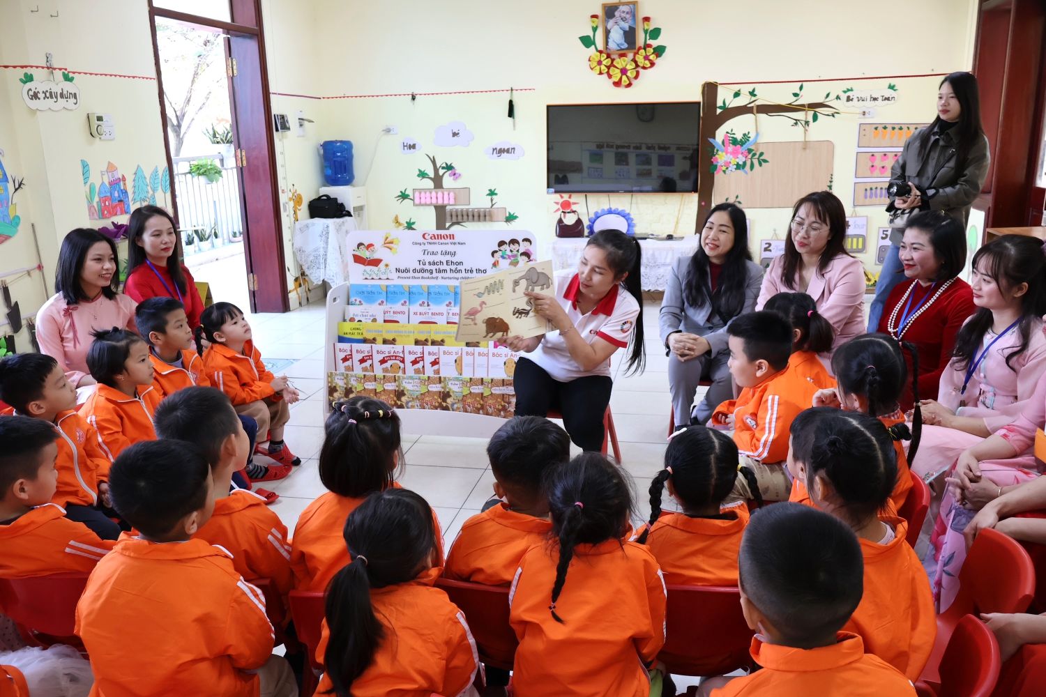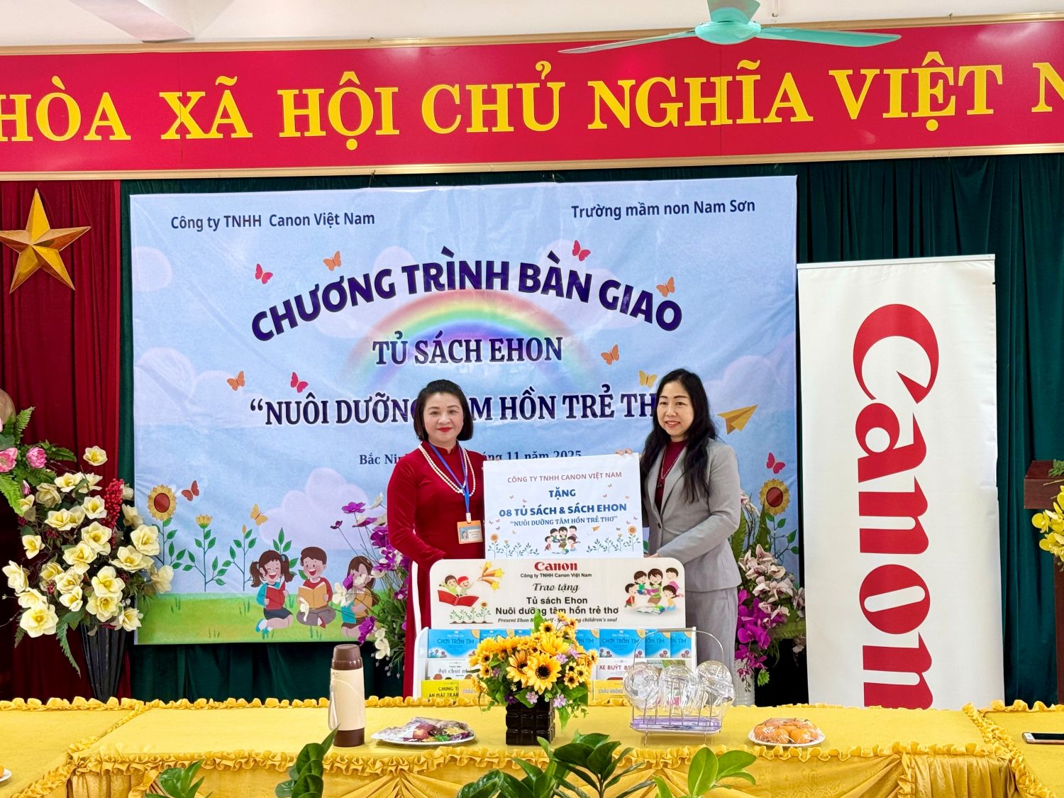 Canon Việt Nam vừa tổ chức chương trình trao tặng tủ sách và sách tranh truyện Ehon cho các em học sinh tại Trường Mầm non Nam Sơn và Trường Mầm non Hoàn Sơn 1 tỉnh Bắc Ninh. Trong chương trình, đại diện Canon Việt Nam đã trao tặng tổng cộng 14 tủ sách cùng hơn 800 cuốn sách tranh truyện Ehon chọn lọc cho hai trường. Đây là những món quà ý nghĩa, góp phần làm phong phú thêm nguồn tài liệu học tập và giải trí cho cô và trò nhà trường. Bên cạnh đó, Canon Việt Nam còn tổ chức hoạt động đọc sách tranh truyện Ehon cho các em học sinh nhà trường. Buổi đọc sách đã nhận được sự yêu thích và hưởng ứng nhiệt tình từ các em nhỏ.