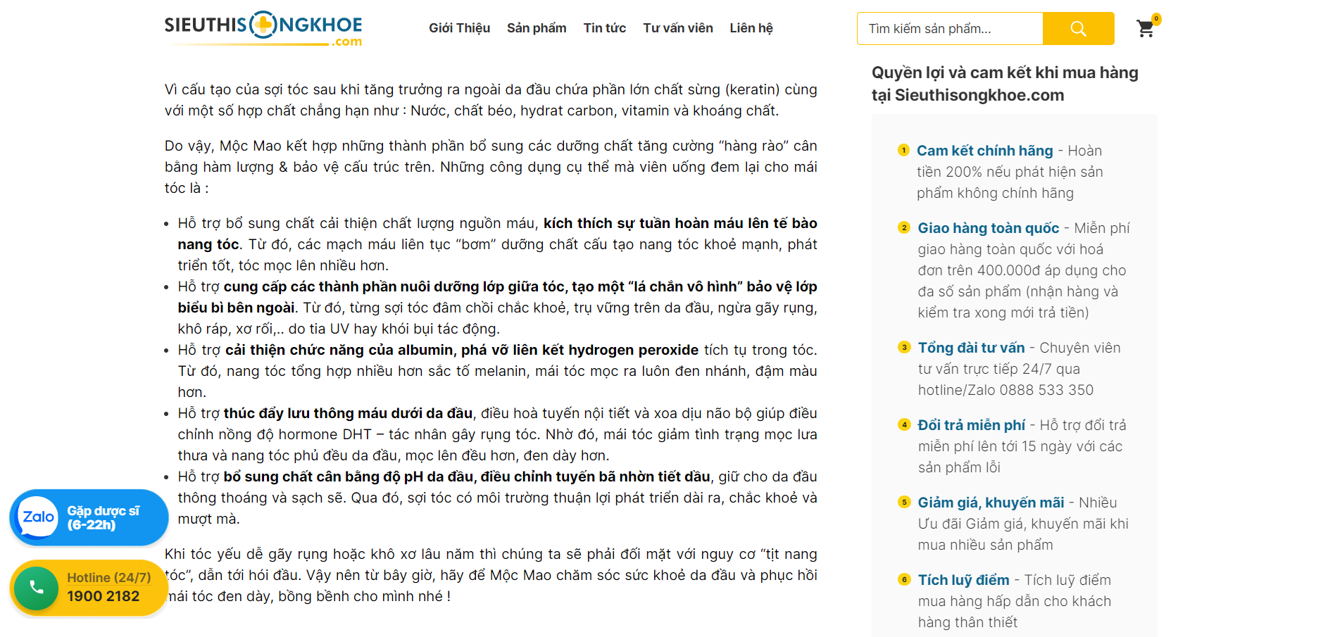 Cùng với đó, website này cũng quảng cáo sản phẩm thực phẩm bảo vệ sức khỏe Mộc Mao "ngoài việc tái tạo & cung cấp dưỡng chất cấu tạo nên sợi tóc còn mang đến chức năng tăng cường tuần hoàn máu".