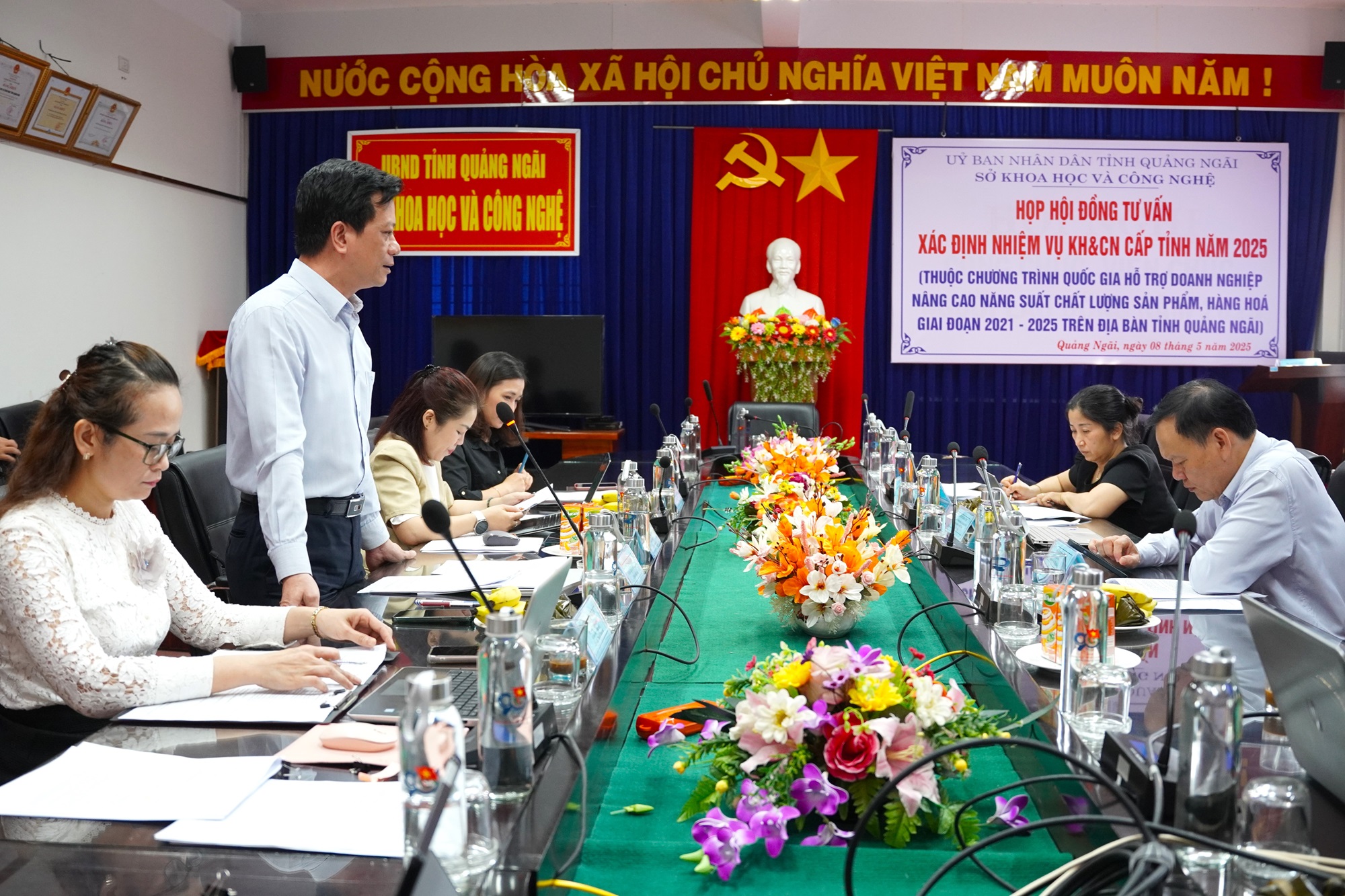 Sở Khoa học và Công nghệ tỉnh Quảng Ngãi tổ chức cuộc họp Hội đồng tư vấn xác định nhiệm vụ khoa học và công nghệ cấp tỉnh thuộc Chương trình quốc gia hỗ trợ doanh nghiệp nâng cao năng suất, chất lượng sản phẩm, hàng hóa giai đoạn 2021-2025. Cuộc họp đã tập trung xem xét, đánh giá 2 nhiệm vụ quan trọng: Xây dựng mô hình điểm nâng cao năng suất chất lượng dựa trên áp dụng giải pháp Năng suất xanh trên địa bàn tỉnh Quảng Ngãi; Hỗ trợ doanh nghiệp, hợp tác xã xây dựng quy trình và mô hình liên kết sản xuất và tiêu thụ chè, quế và gừng đạt tiêu chuẩn hữu cơ quốc tế (USDA, JAS, EU) tại các hợp tác xã thuộc huyện Trà Bồng (Quảng Ngãi).