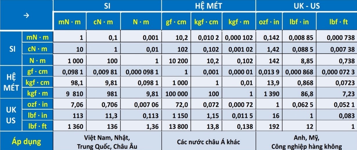Đơn vị đo mô men lực gồm các hệ đơn vị sau: