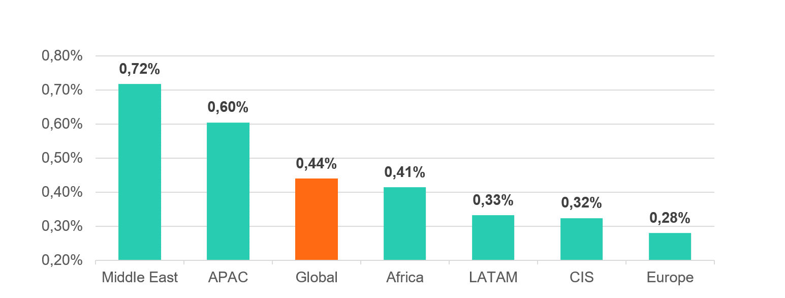 Tỷ lệ người dùng có máy tính bị tấn công bởi phần mềm tống tiền mã hóa, theo khu vực. Nguồn: Kaspersky Security Network