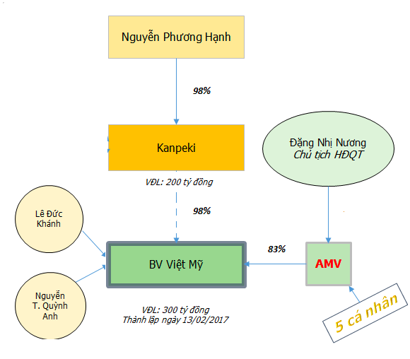 Như vậy, sau khi được 5 cá nhân "bơm" vốn, AMV đã tiến hành mua 83% cổ phần của BV Việt Mỹ từ Kanpeki - doanh nghiệp vốn được sở hữu gần như hoàn toàn từ bà Nguyễn Phương Hạnh.
