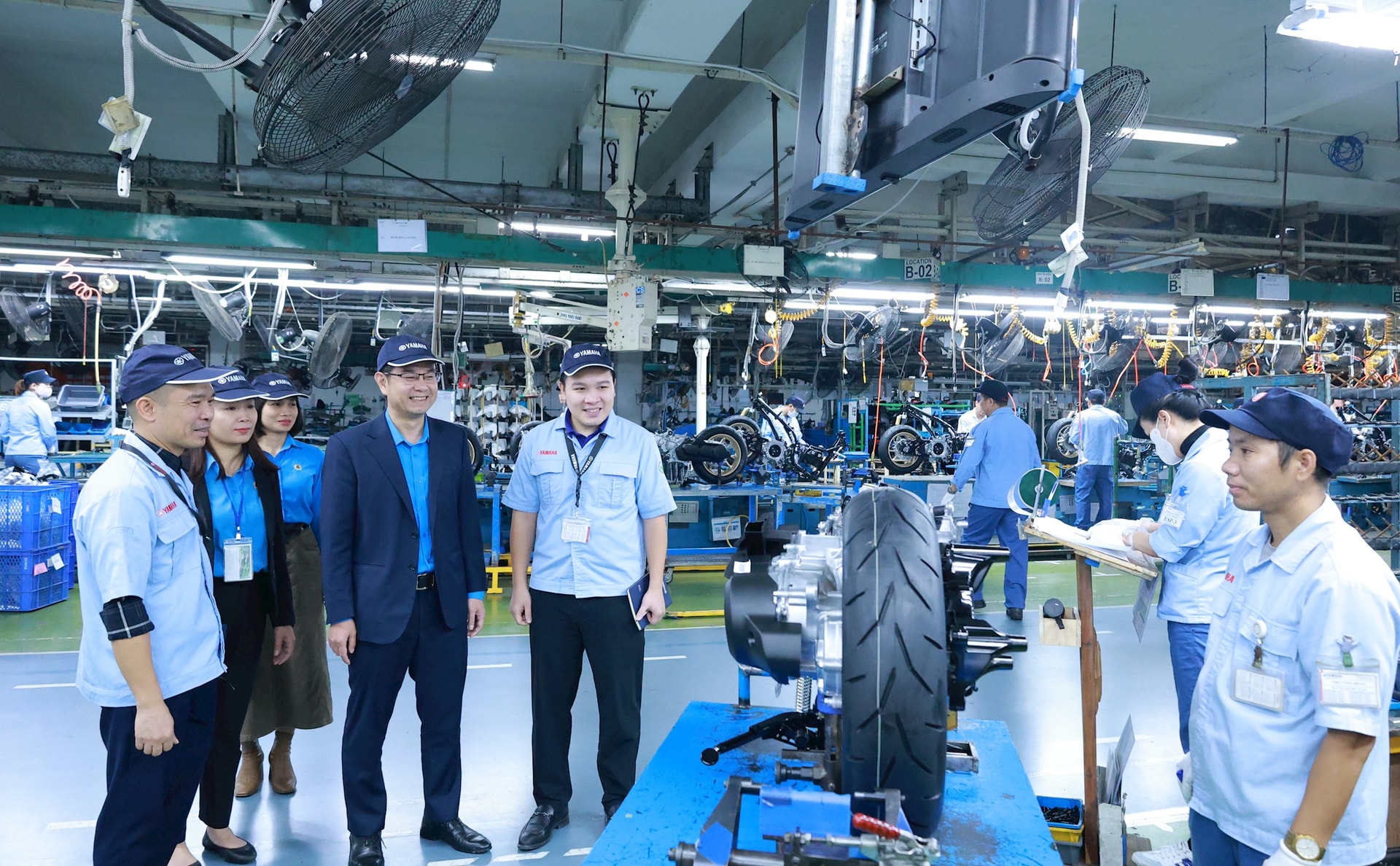Lãnh đạo Liên đoàn Lao động thành phố Hà Nội thăm, động viên sản xuất tại Công ty TNHH Yamaha Motor Việt Nam.