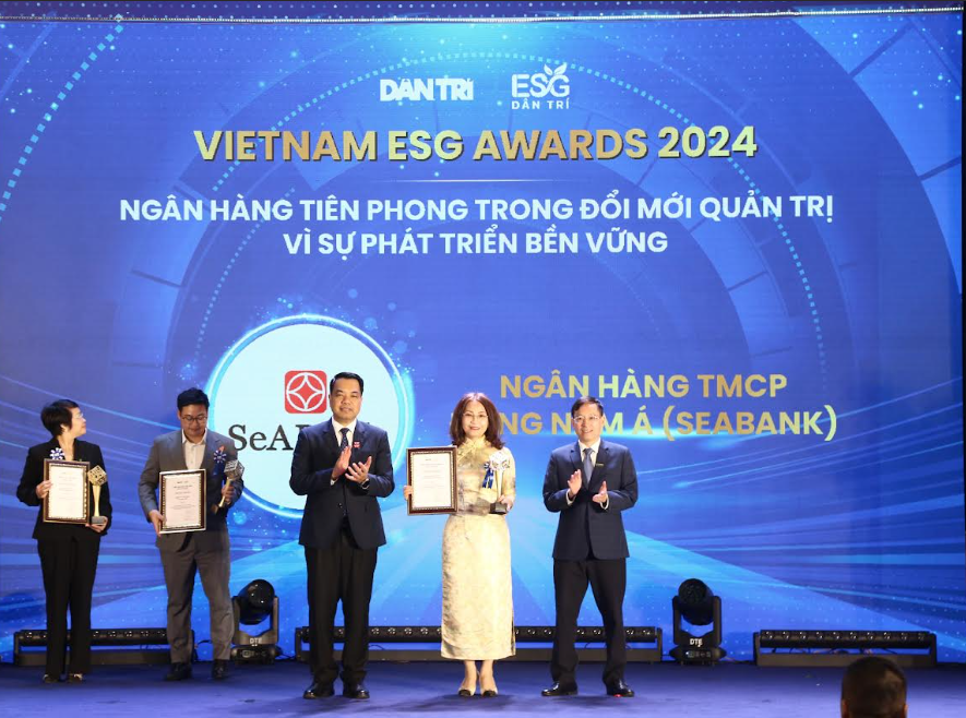 (VietQ.vn) - Ngân hàng TMCP Đông Nam Á (SeABank, HOSE: SSB) vừa vinh dự nhận danh vị “Ngân hàng tiên phong trong đổi mới quản trị vì sự phát triển bền vững” tại lễ trao giải Vietnam ESG Awards lần thứ nhất do Báo Dân trí tổ chức. Giải thưởng ghi nhận những nỗ lực, sáng kiến và hiệu quả mang lại của SeABank trong thực thi các tiêu chí Môi trường - Xã hội - Quản trị (ESG) và lan tỏa tinh thần trách nhiệm tới cộng đồng.