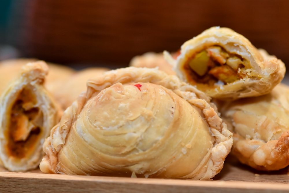 Bánh Curry Puff là món ăn nhẹ nổi tiếng ở Singapore được làm từ nước sốt cà ri, thịt gà, khoai tây và trứng.