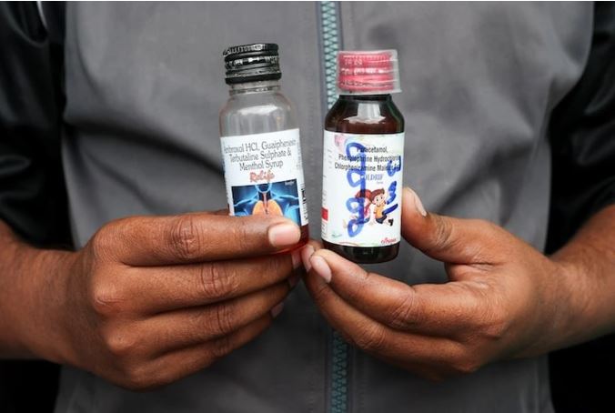 Một người đàn ông giơ hai loại siro ho, Coldrif và Relife, liên quan đến cái chết của nhiều trẻ em ở bang Madhya Pradesh, Ấn Độ, hôm 10/10.