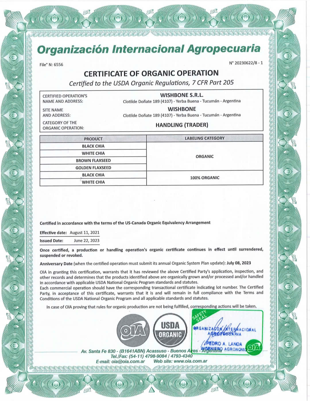 Giấy chứng nhận hữu cơ cấp cho sản phẩm hạt chia được ONFOD phân phối.