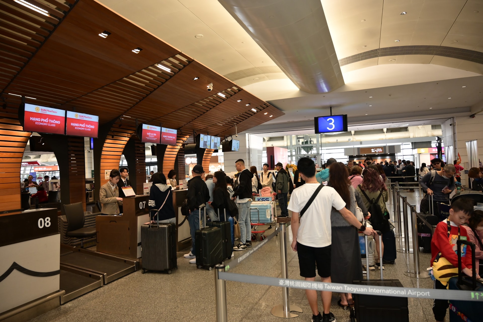 Những khách hàng Đài Loan đầu tiên làm thủ tục bay đến Đảo NgọcSong song với mở rộng mạng bay, Sun PhuQuoc Airways định vị là hãng hàng không dịch vụ đầy đủ (full-service), cung cấp trải nghiệm trọn vẹn với suất ăn, hành lý ký gửi và khoang Thương gia được thiết kế riêng tư, tiện nghi. Từ ngày 1/4/2026, hãng đưa vào vận hành phòng chờ cao cấp Sun Executive Lounge tại Cảng hàng không quốc tế Phú Quốc, góp phần nâng cao trải nghiệm hành khách ngay từ điểm khởi hành.