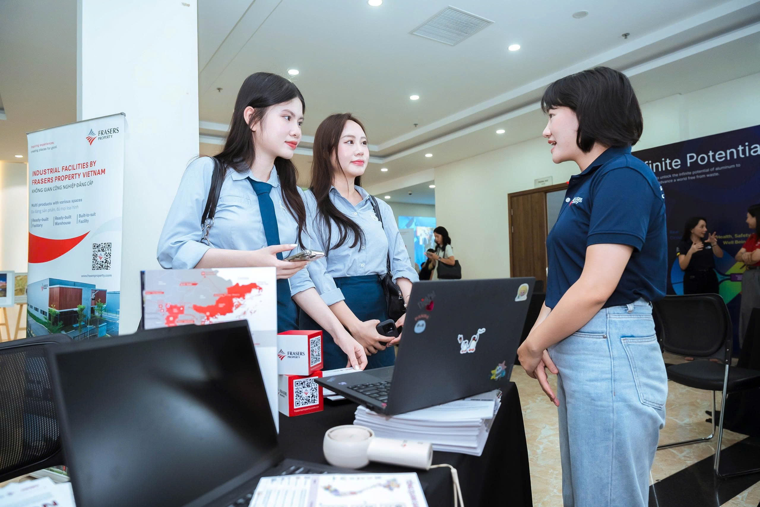 Đại diện Frasers Property Vietnam trao đổi với sinh viên Học viện Ngoại giao tại khu vực trưng bày sáng kiến bền vững và cơ hội nghề nghiệp của doanh nghiệp.