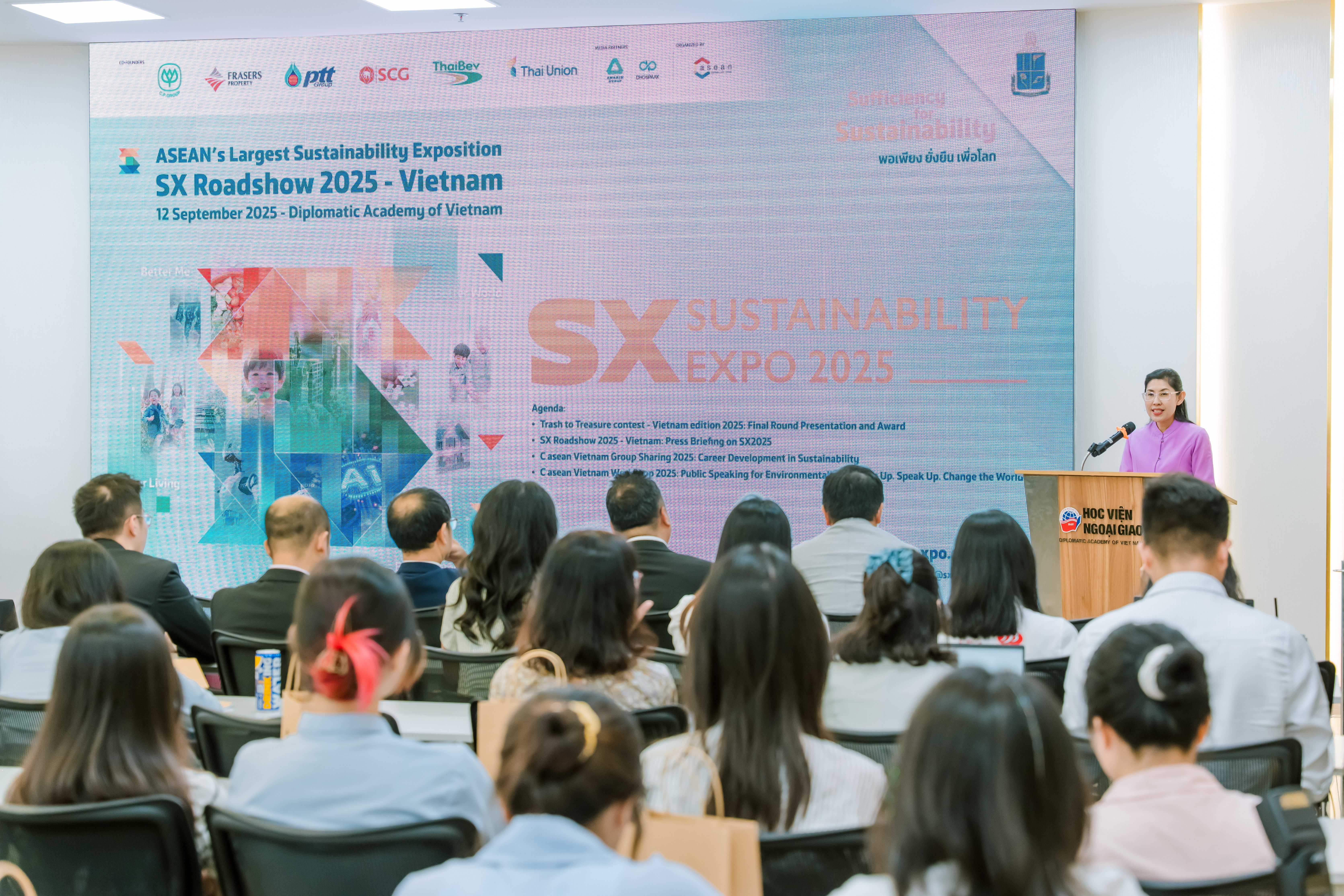 (VietQ.vn) - Ngày 12/9/2025, tại Học viện Ngoại giao (Hà Nội), chuỗi hoạt động SX Roadshow 2025 – Vietnam đã được tổ chức, thu hút đông đảo đại biểu trong và ngoài nước. Đây là sự kiện giới thiệu Sustainability Expo 2025 (SX 2025) – triển lãm phát triển bền vững lớn nhất ASEAN, sẽ diễn ra vào cuối tháng 9 tại Thái Lan.