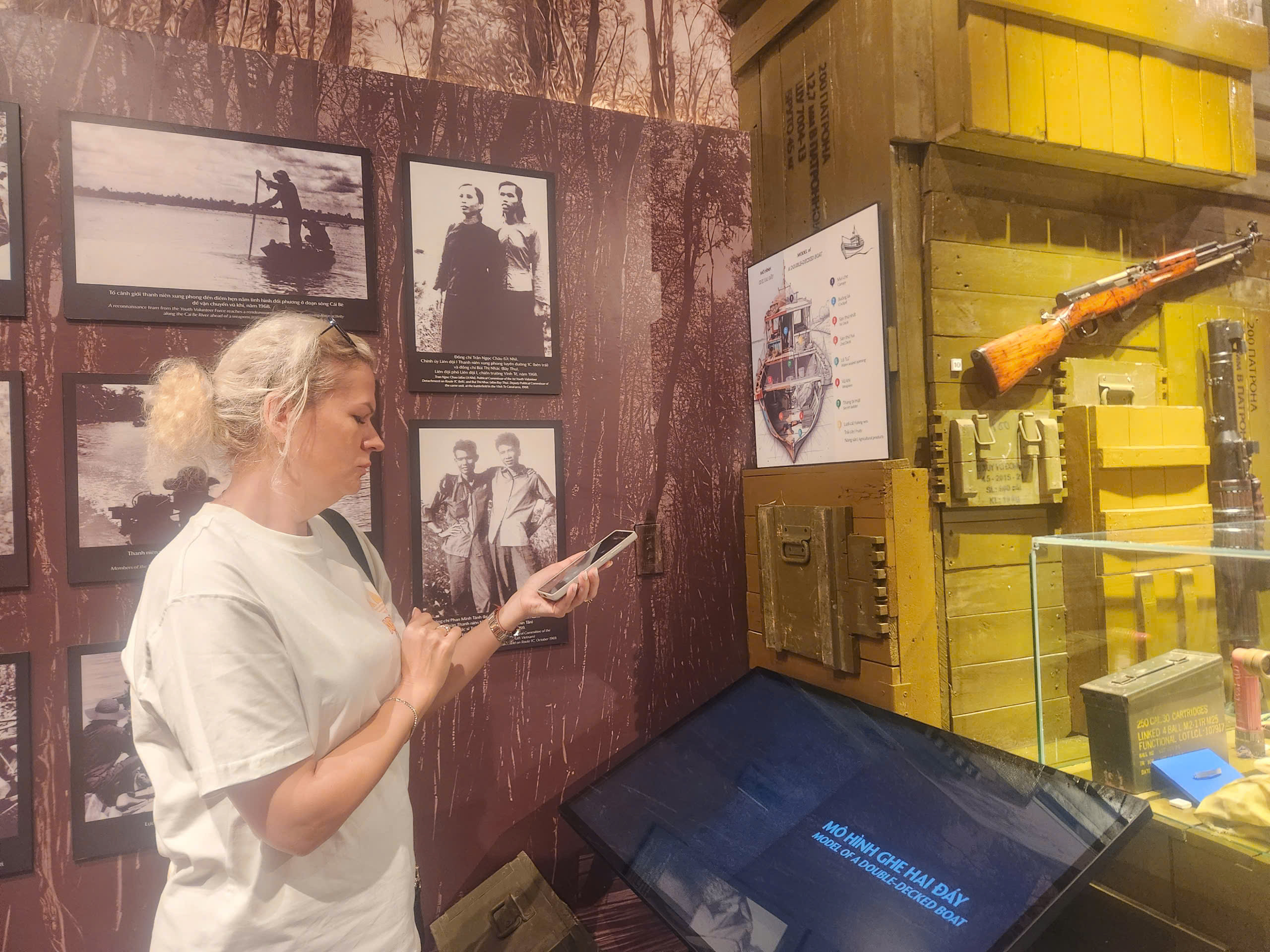 Không chỉ các bạn trẻ mà khách du lịch nước ngoài cũng đến tham quan, tìm hiểu các tư liệu được trưng bày trong Chuyên đề "Thời thanh xuân trên đường 1C huyền thoại”. (Ảnh: Kim Thoa)