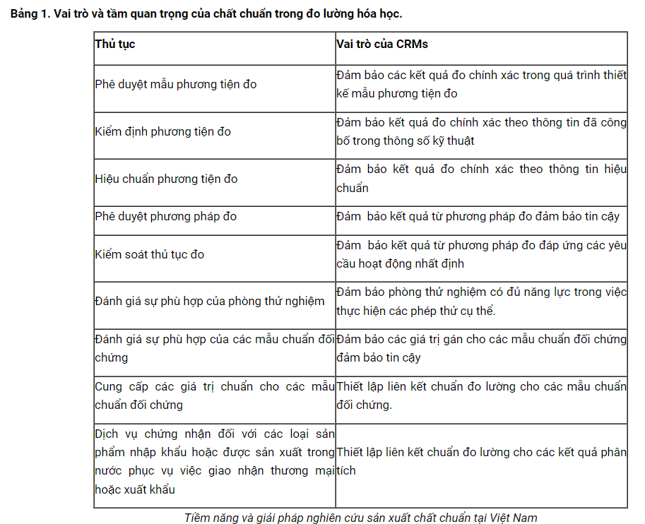 Bảng 1. Vai trò và tầm quan trọng của chất chuẩn trong đo lường hóa học.