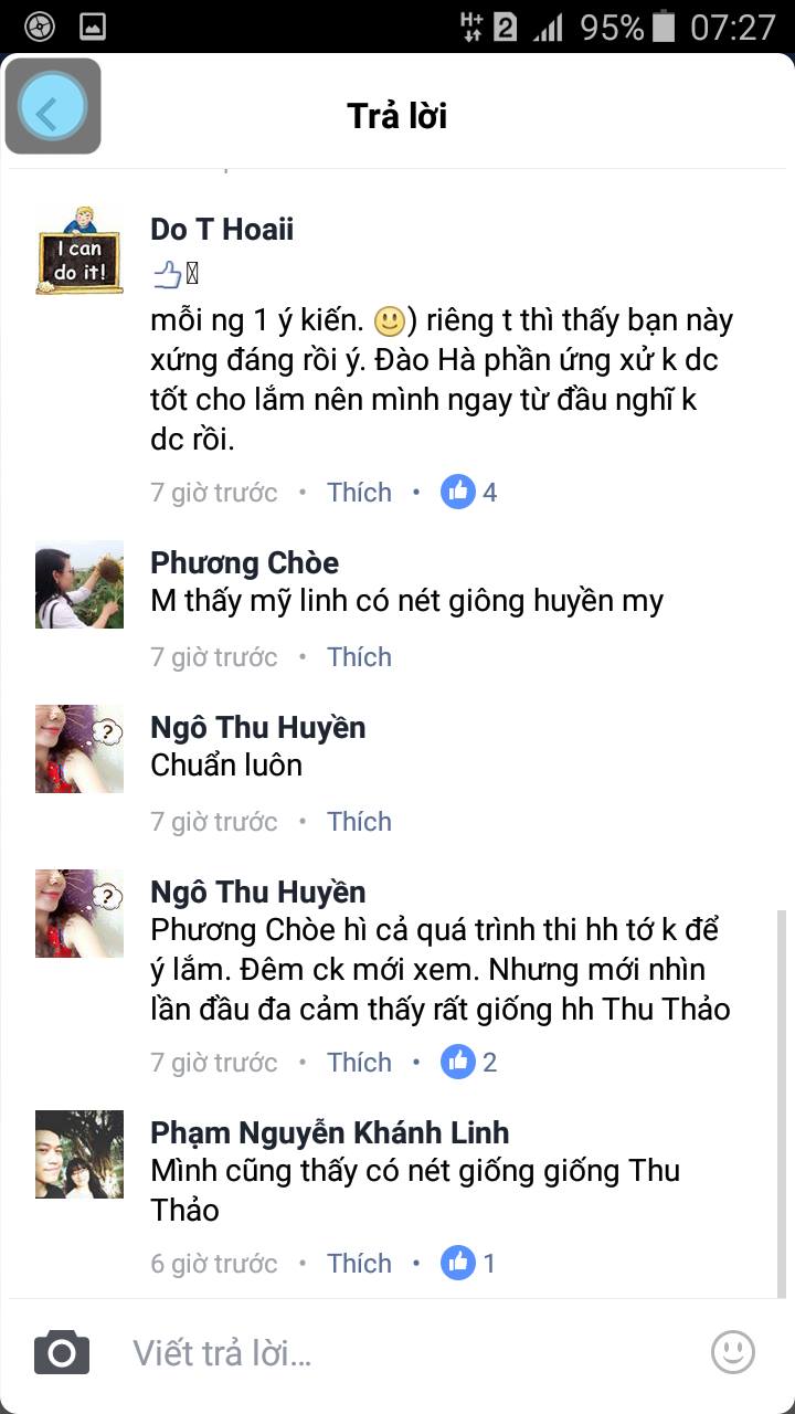 Bạn khán giả có nich name Yến Báo chia sẻ: “Mình thấy hoa hậu năm nay khá xinh, mặt mày phúc hậu quý phải, dù không phải là người xinh nhất nhưng chị xứng đáng nhận được danh hiệu này. Hãy làm tốt sứ mệnh của một người đẹp chị nhé.”