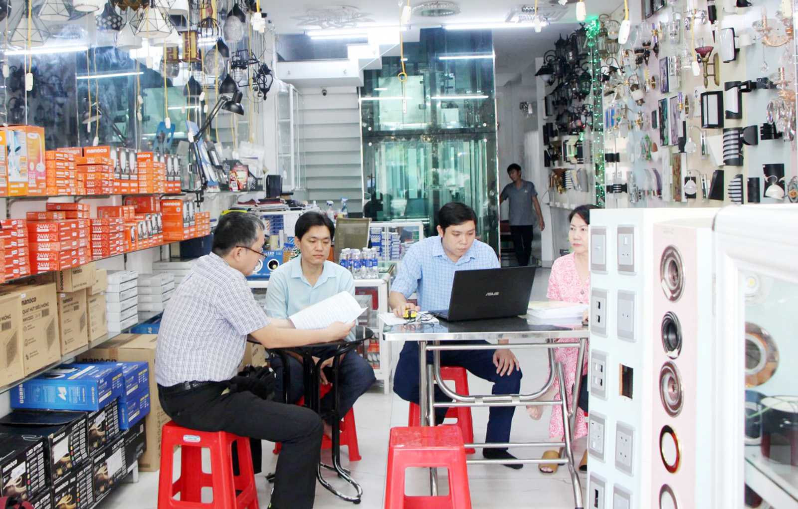 Đoàn kiểm tra hộ kinh doanh thiết bị điện. (Ảnh: Sở KH&CN An Giang)