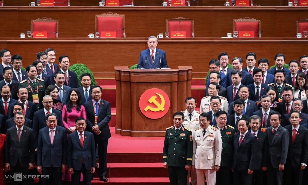 Tổng Bí thư Tô Lâm và các ủy viên Trung ương khóa XIV ra mắt đại hội.