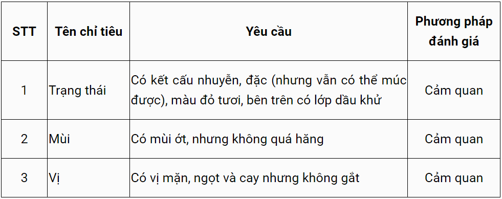 Để được công nhận là nhãn hiệu chứng nhận, chủ đơn phải cung cấp một văn bản đặc biệt là quy chế sử dụng nhãn hiệu. Trong đó, bao gồm các tiêu chí về cảm quan chất lượng sản phẩm, xuất xứ nguyên liệu được miêu tả chi tiết, nhằm hướng dẫn các tổ chức, cá nhân sản xuất tương ớt Hội An cách thức hoạt động phù hợp. Bên cạnh đó, còn là cơ sở pháp lý cho hoạt động kiểm tra, giám sát việc sử dụng nhãn hiệu chứng nhận của cơ quan quản lý. Tác giả đưa ra một số chỉ tiêu đề nghị như Bảng. (Xem Bảng)