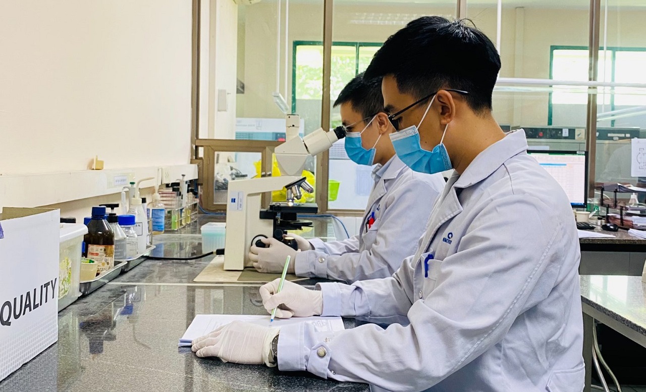 Các thử nghiệm viên phối hợp kiểm tra hình thái cơ bản của vi sinh vật dưới kính hiển vi và ghi chép báo kết quả.
