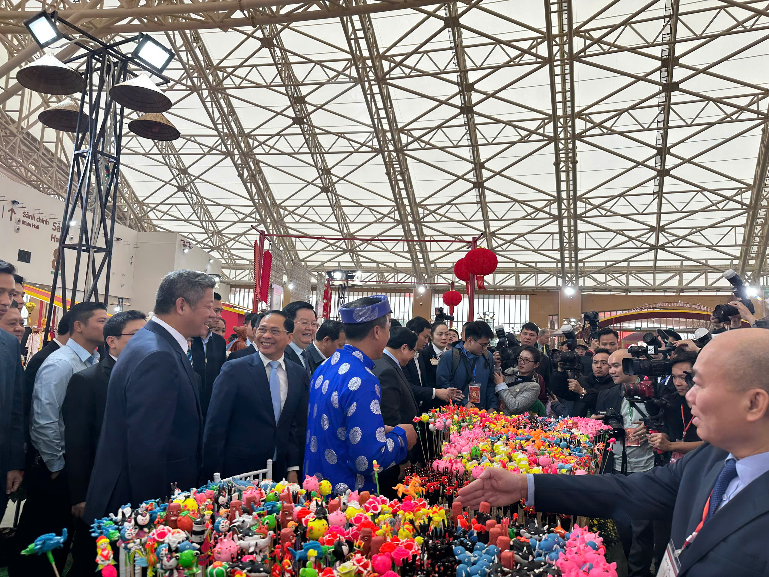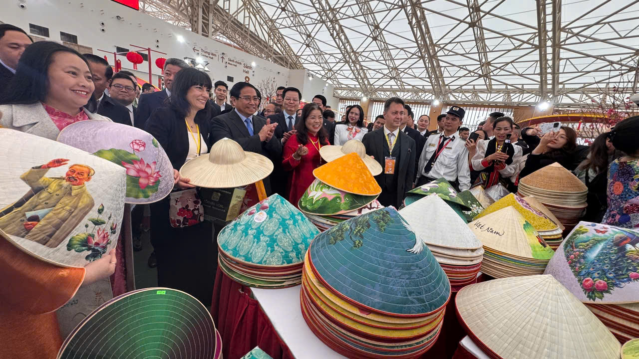 Thủ tướng Chính phủ Phạm Minh Chính cùng các đại biểu thăm gian hàng làng nghề Nón Chuông tại "Tết Sum vầy"