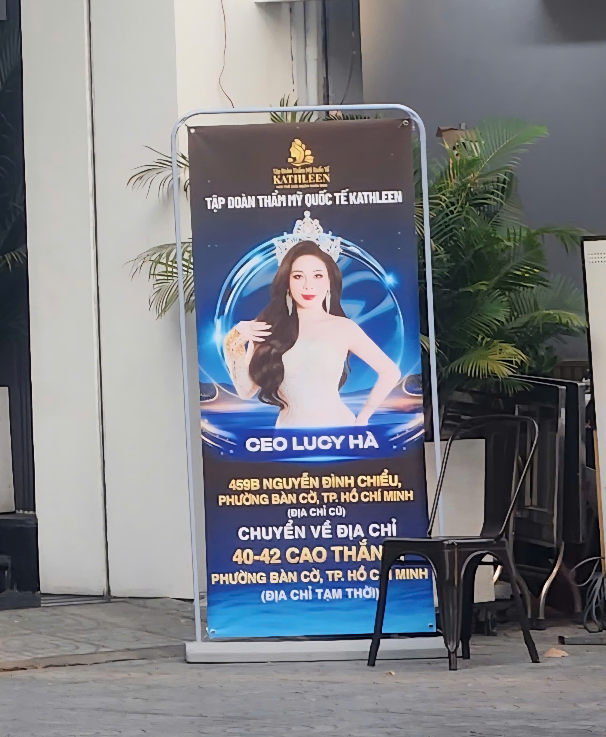 Khi đến địa chỉ nói trên, chúng tôi khá bất ngờ khi đây là nơi hoạt động của một cơ sở thẩm mỹ khác. Phía dưới vỉa hè là tấm biển có hình CEO Lucy Hà với dòng thông báo “Tập đoàn Thẩm mỹ Quốc tế Kathleen 459B Nguyễn Đình Chiểu, phường Bàn Cờ, TP.Hồ Chí Minh (địa chỉ cũ) chuyển về địa chỉ 40 - 42 Cao Thắng, phường Bàn Cờ, TP.Hồ Chí Minh (địa chỉ tạm thời)".