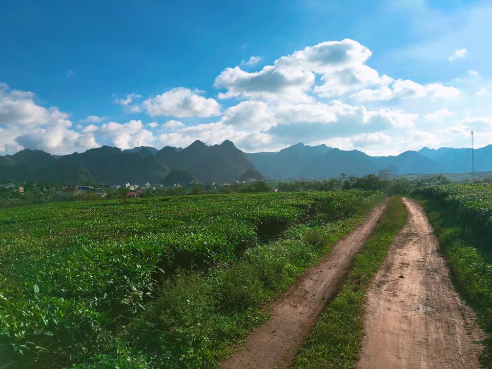 Con đường cao Mộc xanh đẹp mê mẩn với trời xanh mấy trắng, hoa mận và thảo nguyên chè xanh ngát